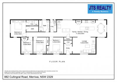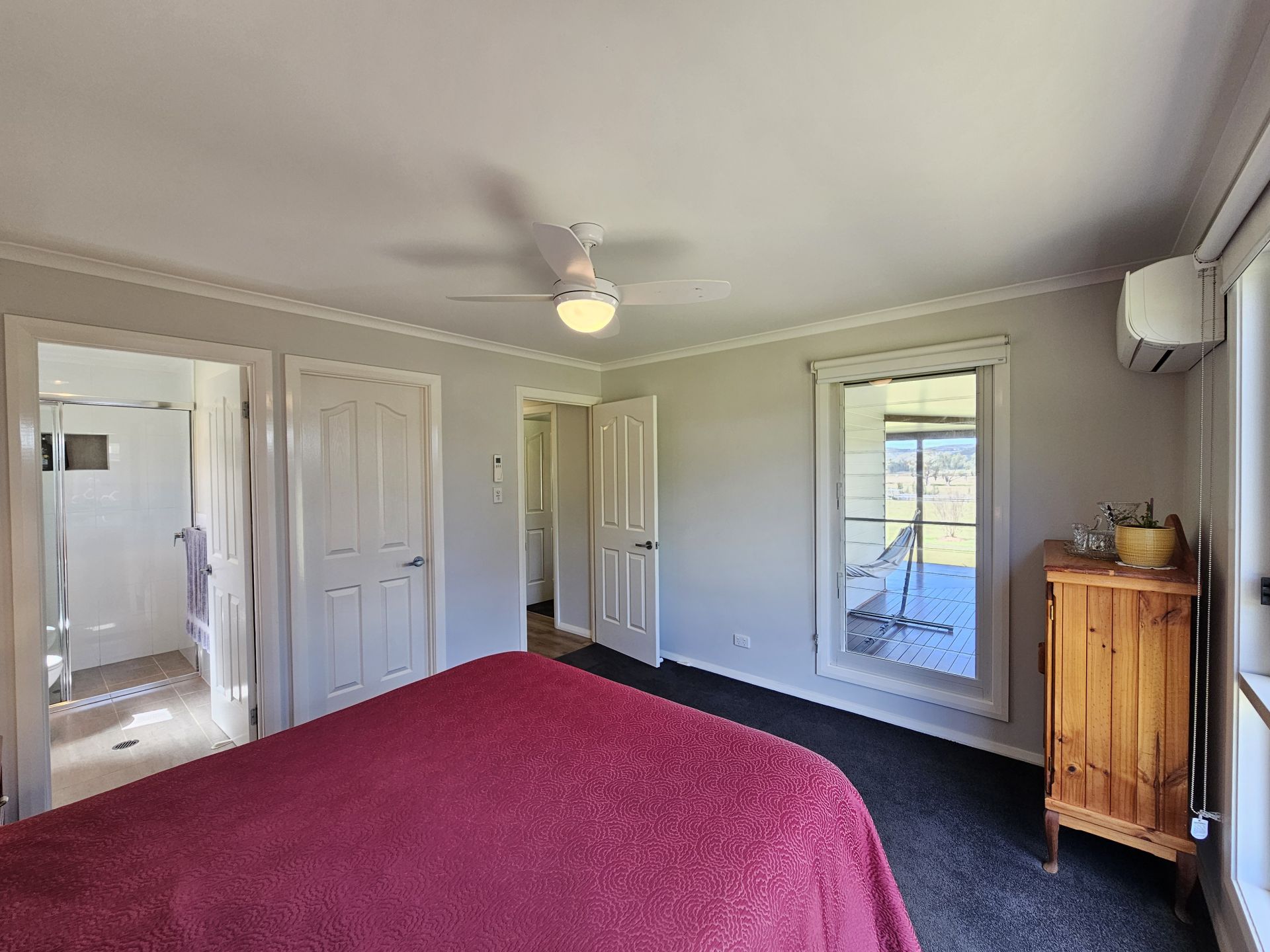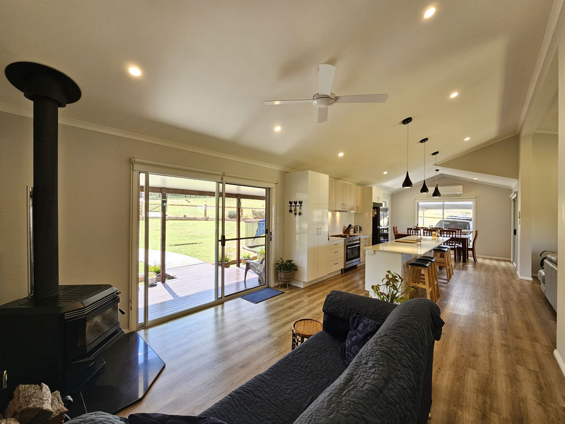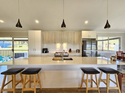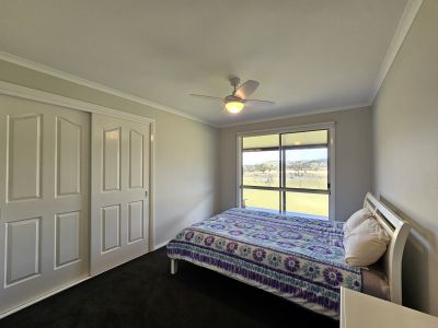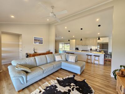 The home is 8 years old and presents in as new condition having been superbly maintained by the vendors. It features four big bedrooms, the main with a walk-in robe, ensuite-and reverse cycle air condition. All bedrooms have built-in robes and ceiling fans. The home includes two living areas: a lounge at the front with views over the paddocks and an open-plan kitchen, dining & living room at the rear with combustion fire, reverse cycle A/C and raked ceilings giving it a lovely spacious feel. The kitchen is in excellent order and includes a 900mm gas cooktop, electric oven, huge island bench & walk in pantry. The home has extra wide verandahs front and rear to sit and take in the beautiful views of the paddocks to the mountains beyond. The property has 110,000 litres of freshwater storage and a stand alone solar system and back up generator. The house yard is fully fenced, providing a safe space for kids and dogs to play.