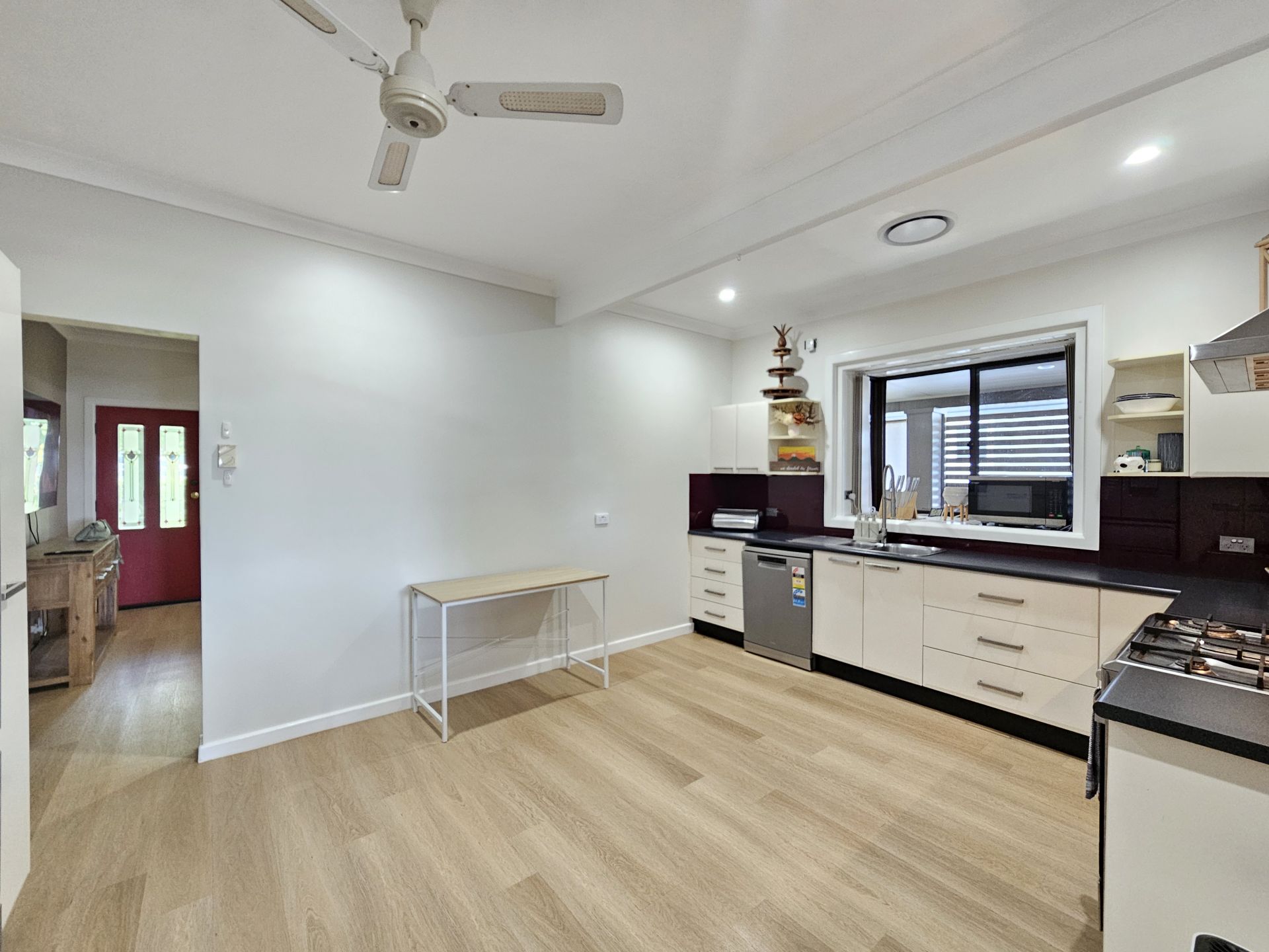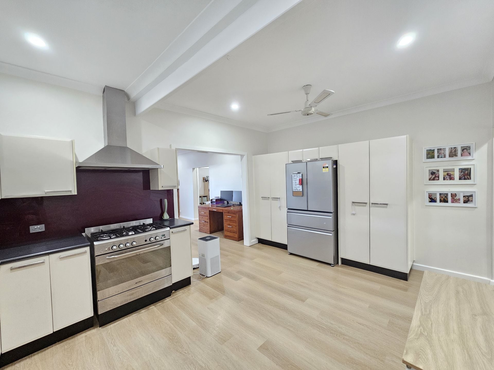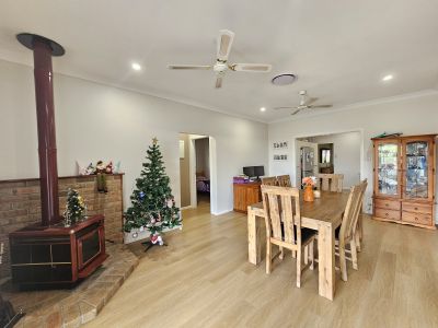 There are four bedrooms, all with built-in robes and ceiling fans, the main with an ensuite and bay window with storage. The home has Ducted R/C A/C throughout. There is a large lounge at the front of the home and an open-plan living area with a combustion fire at the back. The kitchen is in excellent condition and features a dishwasher, a 900mm gas cooktop, and an electric oven plus plenty of room for a dining table.