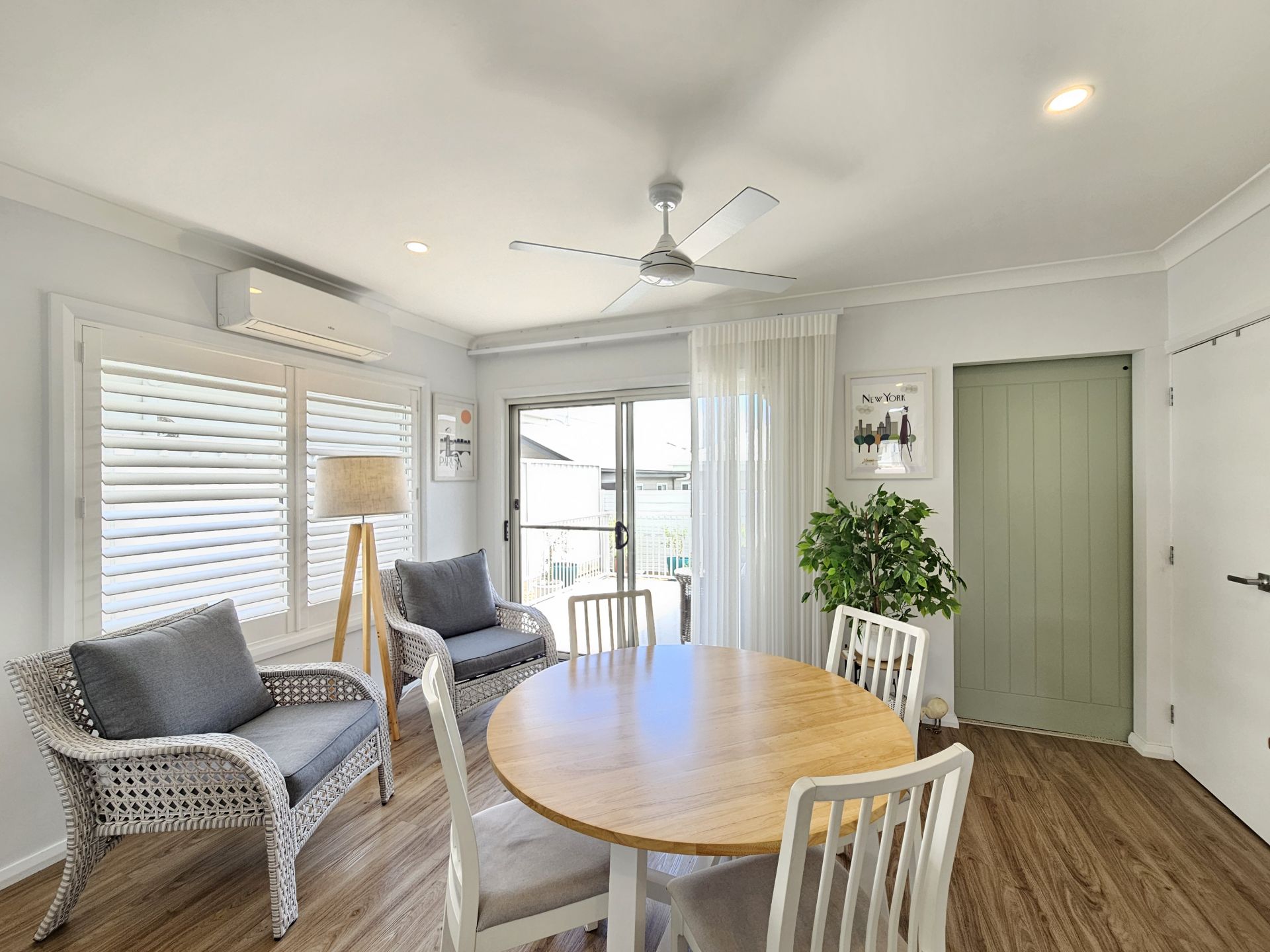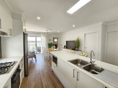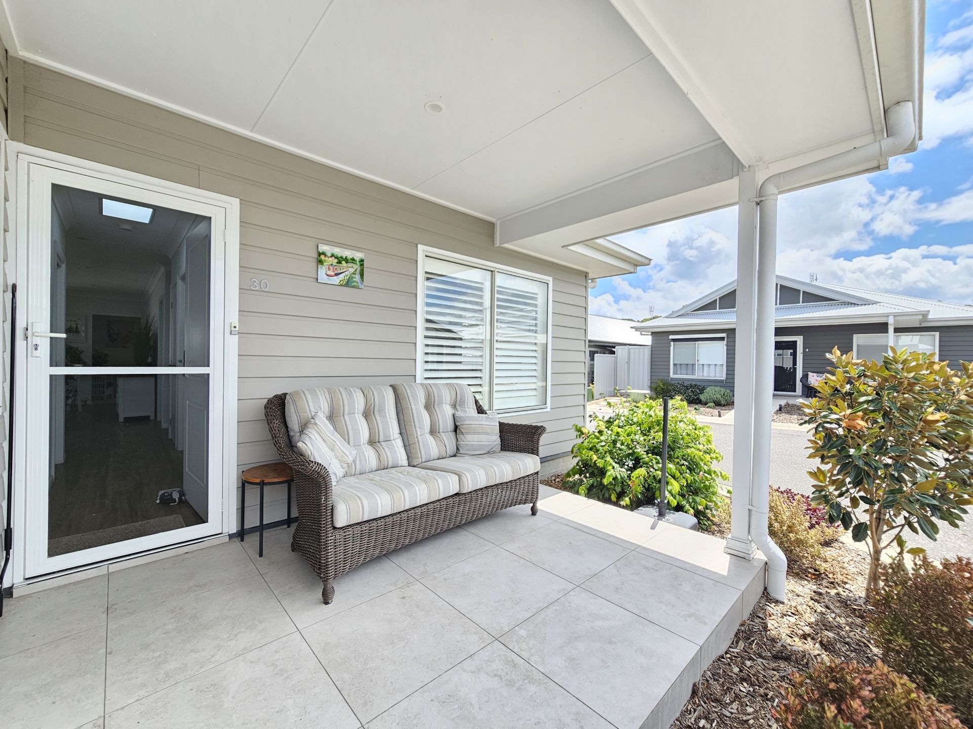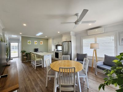 This fantastic 2/3-bedroom home is located within Broadlands gated community. The complex offers a swimming pool, gym, community room with kitchen, games room with pool table, putting and bowling green, outdoor BBQ area and much more. Number 30 sits on a corner block with a BBQ area at the end of the street enjoying Golf Club views. The home features 2 bedrooms, both with built-in robes and ceiling fans, the main with ensuite bathroom. The open plan kitchen, dining and lounge area are a generous size, with the kitchen featuring a breakfast bar, dishwasher, large fridge space and a very impressive under-bench pyrolytic (self-cleaning) oven with "Steam Bake" function – a high-end addition for the home chef. Solar powered skylights in the kitchen and lobby areas flood the home with beautiful natural light. There is a full second living area or optional 3rd bedroom if needed, complete with a stylish barn door that can be closed for privacy. A set of sliding doors flow to the covered back balcony, where a fold-out automatic awning is a standout feature. The sheers are quality Veri Shade blinds which can be walked through, opened, closed or tilted to function as blinds – offering both practicality and style. Other features include plantation shutters and canvas awnings. The yard is fully fenced. There is a single garage with remote door and internal access, plus the laundry is conveniently located within an internal cupboard. A covered front porch provides the perfect place to sit and enjoy the lifestyle village atmosphere. Book your private inspection today! Current site fees are $385 per fortnight. NOTE: You must be over 50 years of age.