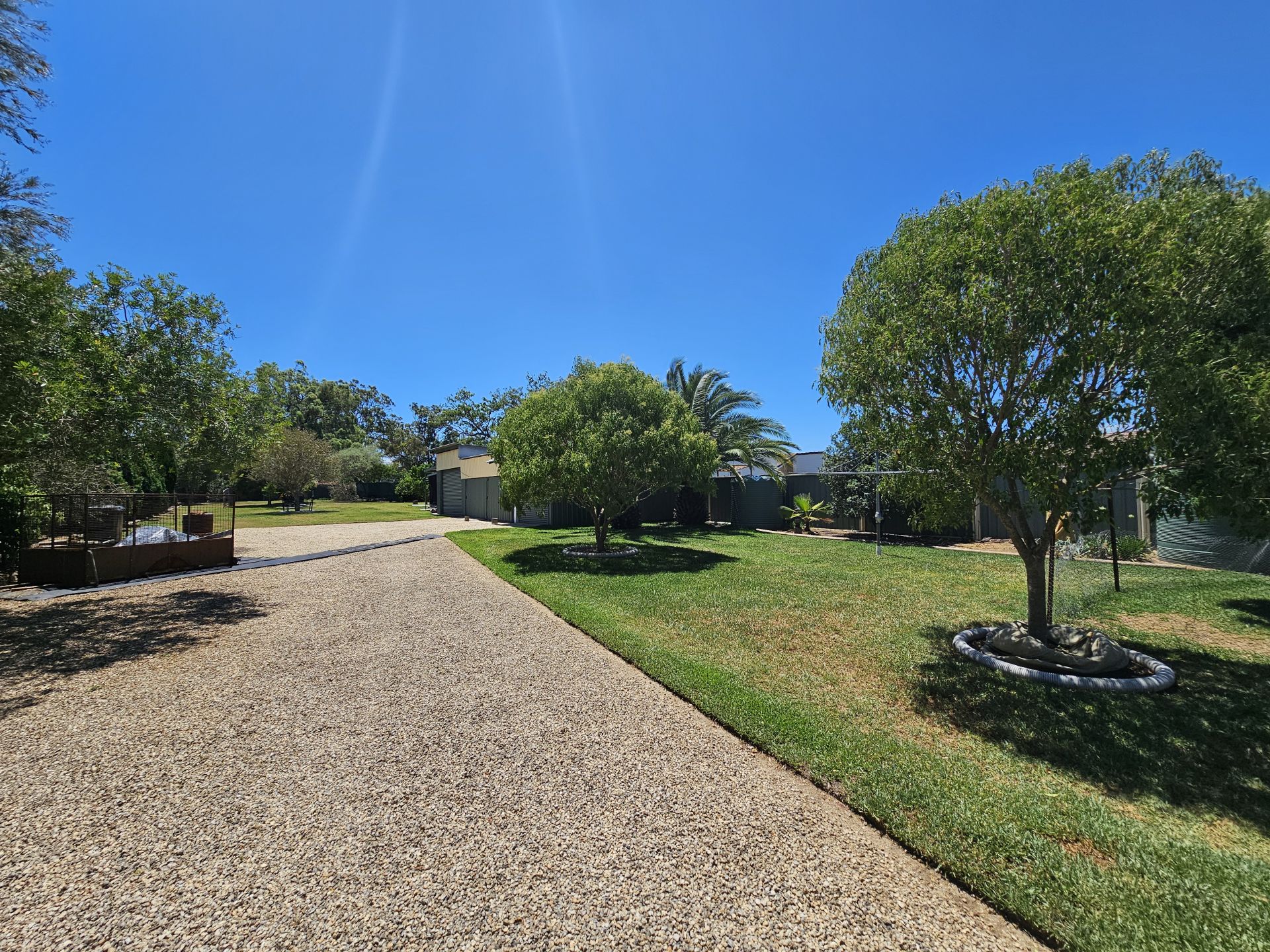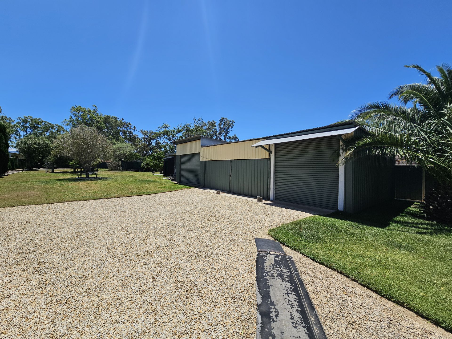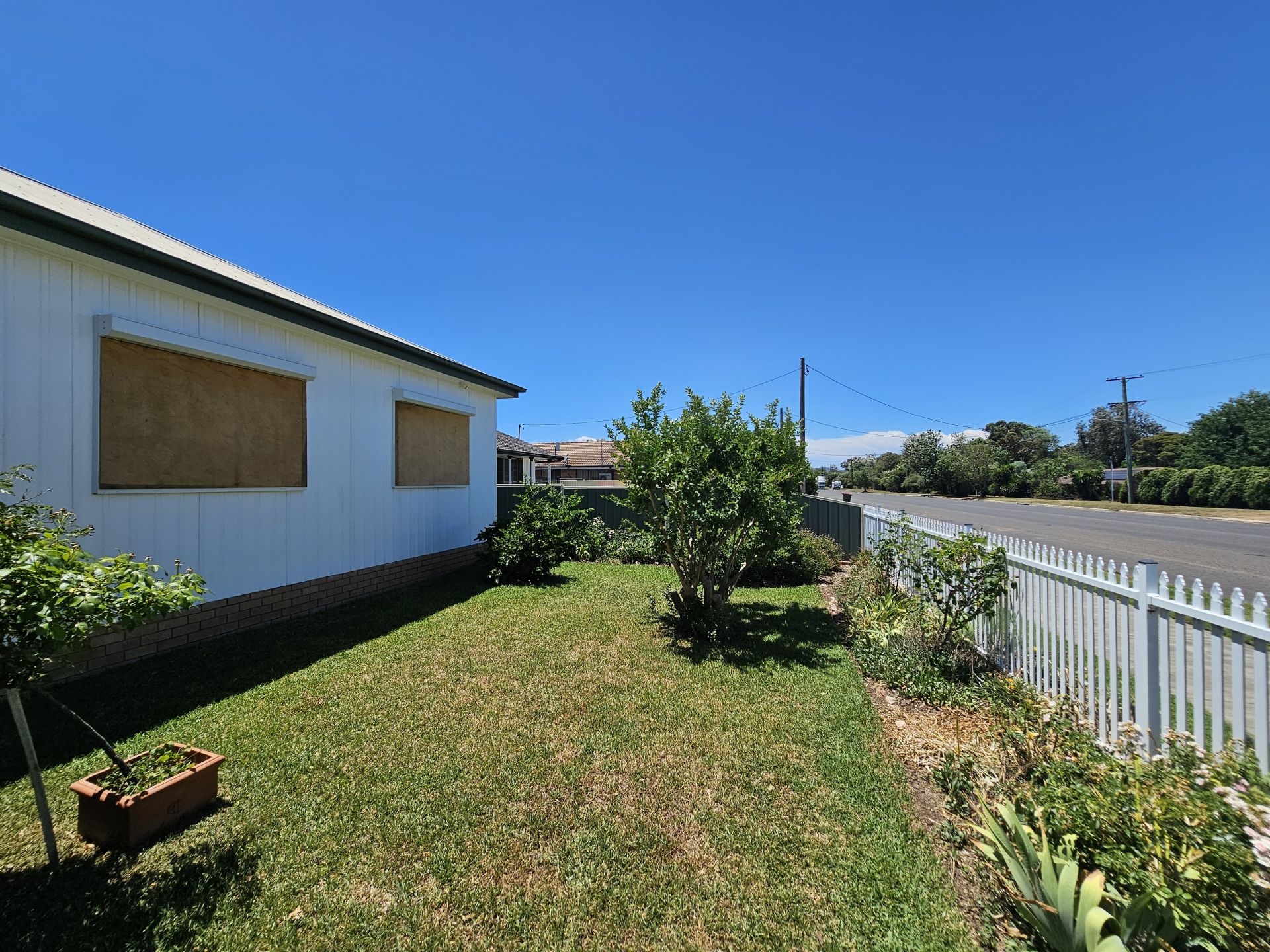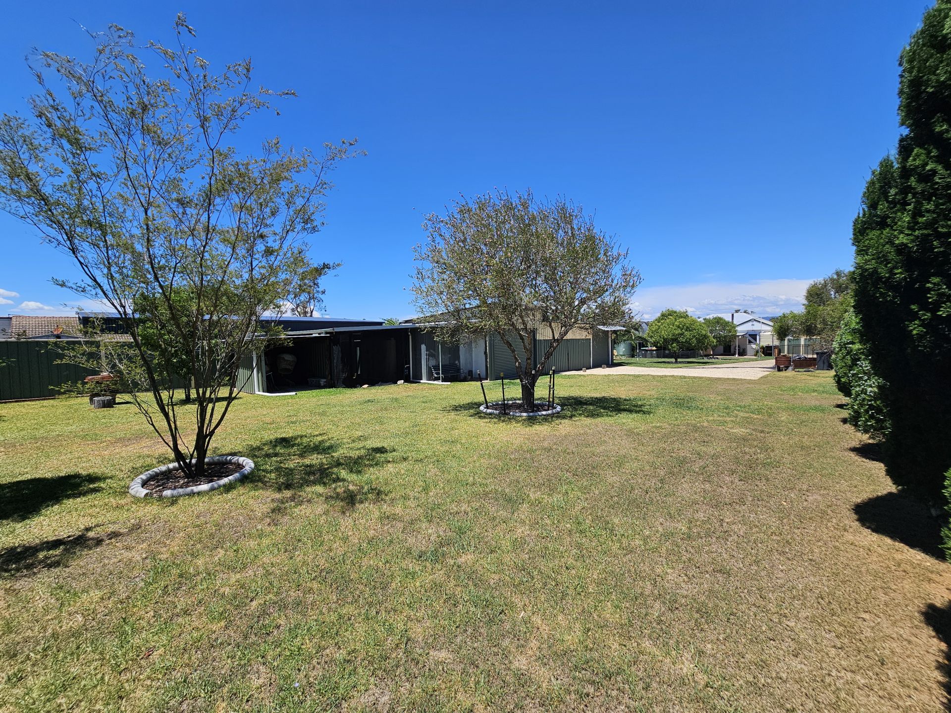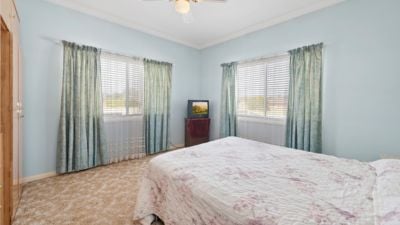 The home has been re-piered, and it has a security system. Outside, the yard is beautifully landscaped with fruit trees and gardens. There is a four-bay shed, a carport, and two garden sheds. There are also freshwater tanks to water the garden.